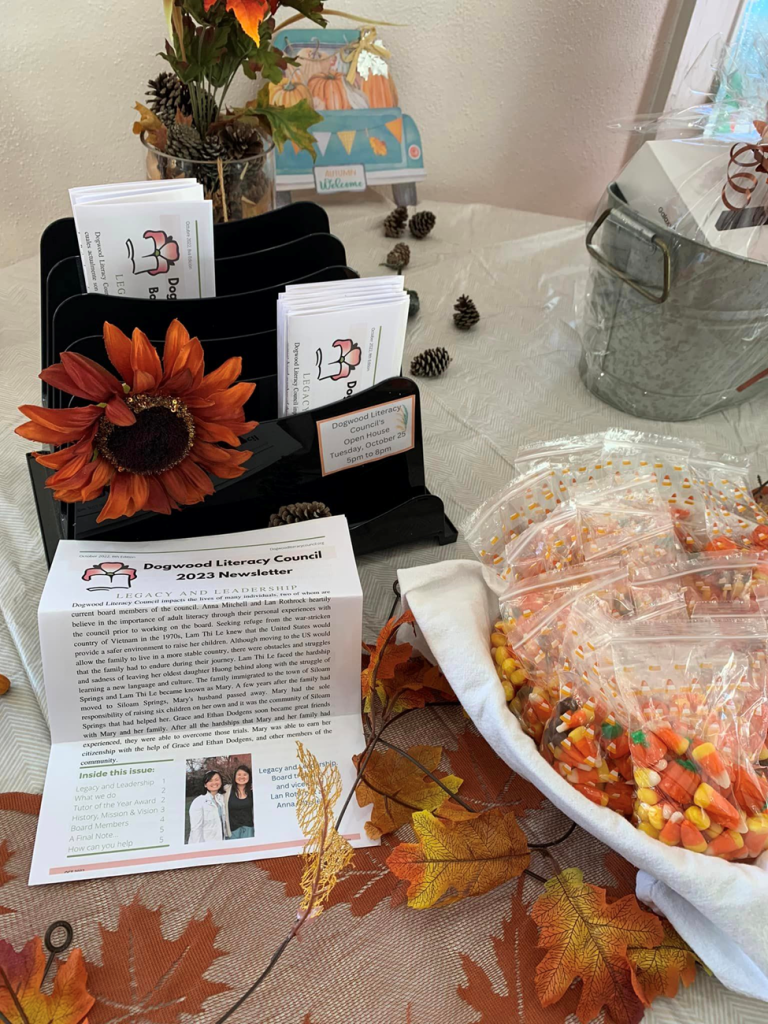 Dogwood Literacy Council’s board of directors did an outstanding job of welcoming the guests at the Open House held on October 25, 2022, to celebrate the council’s move to its new location. The event had a mayoral proclamation. The chamber of commerce held a ribbon cutting to celebrate our Open House.